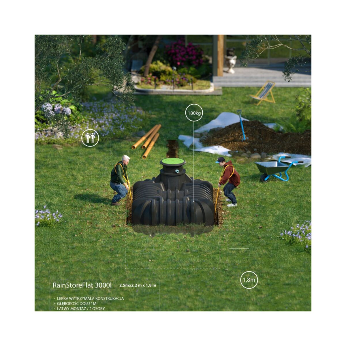 RainStore FLAT este un rezervor Kingspan pentru colectarea și stocarea apei de ploaie, cu o formă plată și compactă, ideală pentru spații strânse din curte. Sistemul este conceput pentru aplicații casnice și profesionale unde necesarul de apă este mai mare decât frecvența ploilor.