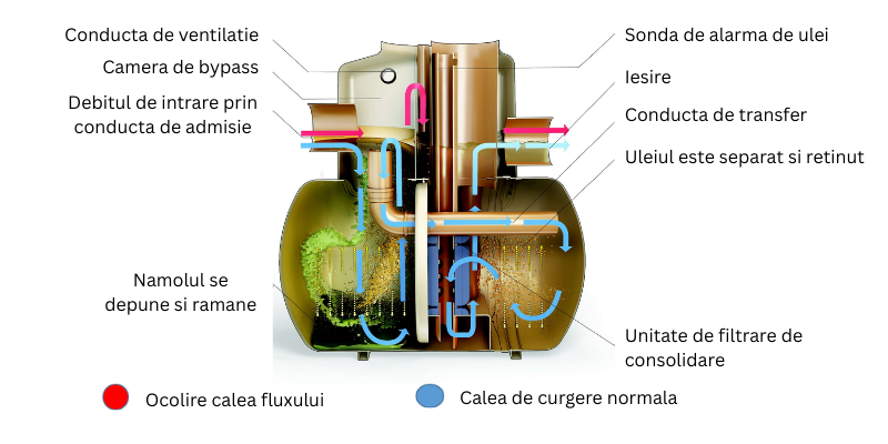 Debitele generate de volume mai mari de precipitatii trec printr-o portiune a separatorului, ocolind camera de separare.